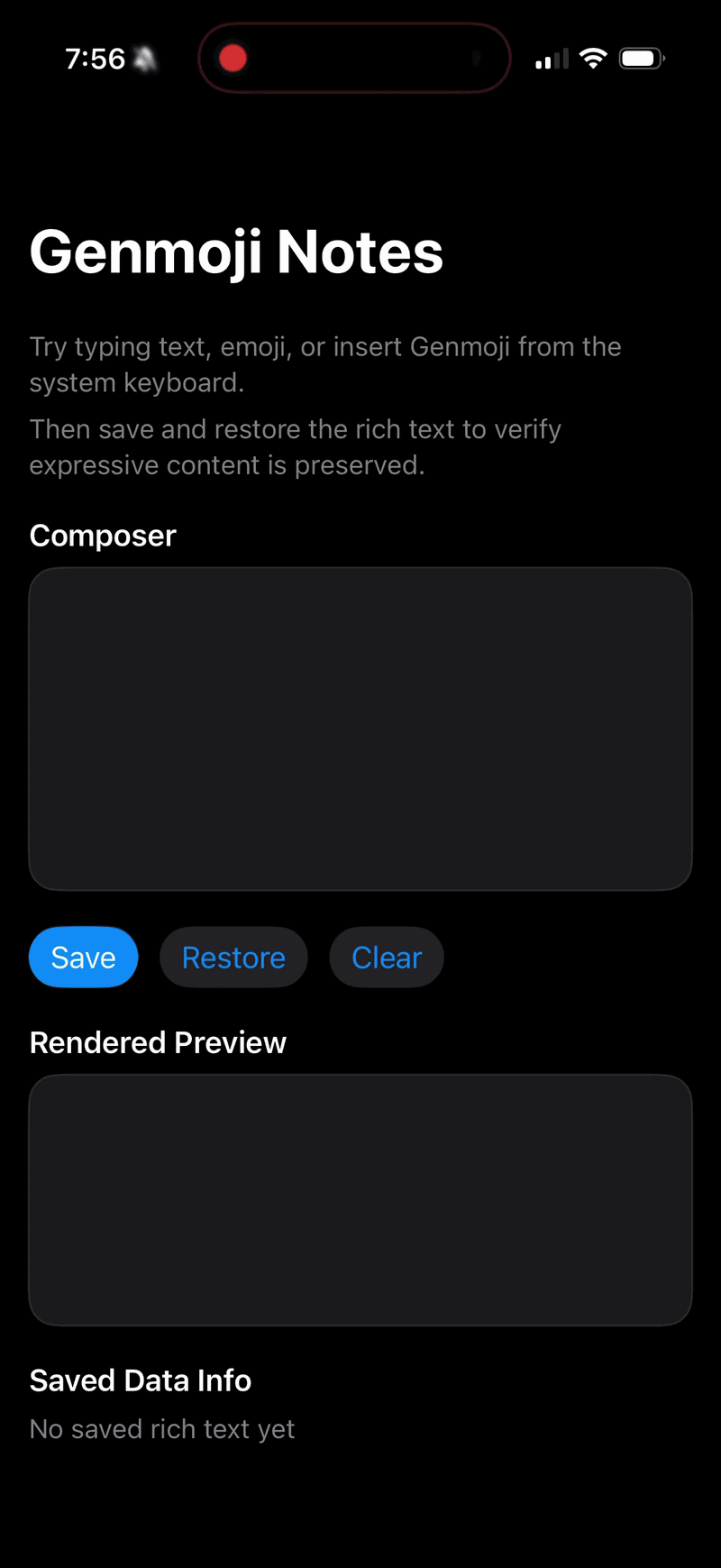 1 2 3 4 5 6 GenmojiNotes ├── ContentView ├── GenmojiTextEditor (UITextView bridge) ├── GenmojiTextPreview ├── GenmojiViewModel └── RichTextStore (serialize/deserialize)